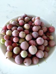 My husband just started harvesting Gooseberries – the photo is a sampling of his harvest. Gooseberries are one of those fruits that we do not see much in the US. The typical supermarket is probably not going to carry them except as a canned item and then, they might only be available around the holidays. You might find them in a good farmer’s market although I suspect that will also be hit or miss.