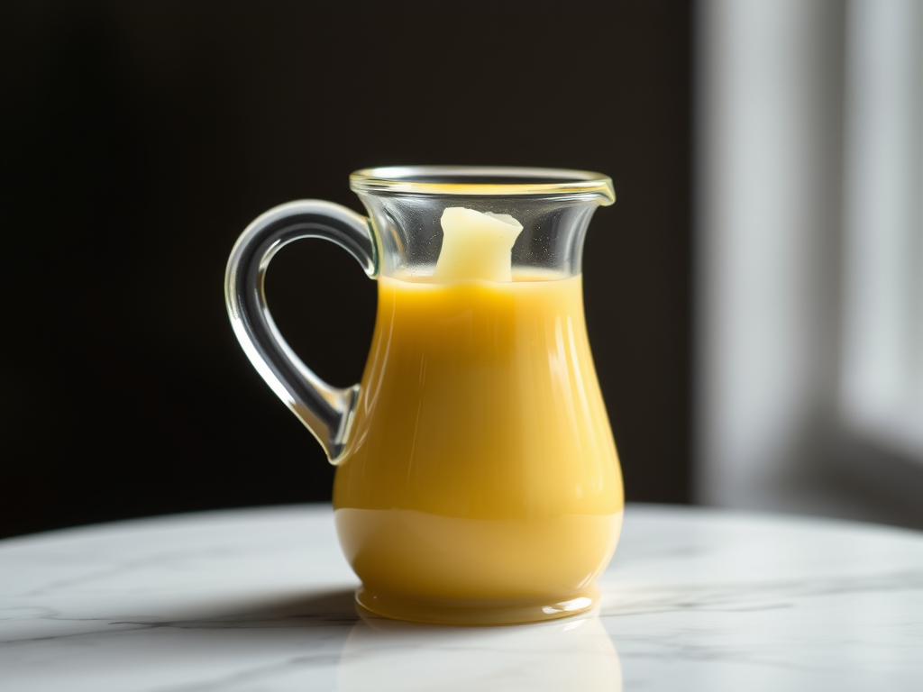 - Place the head of the immersion blender into the bottom of the cup and turn it on. With the blender constantly running, slowly pour the hot butter into the cup in a thin stream to emulsify the egg yolks and lemon juice.